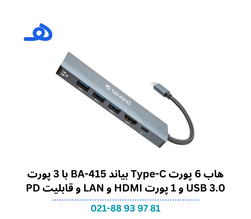 هاب 6 پورت Type C بیاند BA-415 با 3 پورت 3.0 USB و 1 پورت HDMI و LAN و قابلیت PD