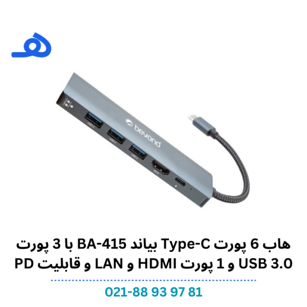 هاب 6 پورت Type C بیاند BA-415 با 3 پورت 3.0 USB و 1 پورت HDMI و LAN و قابلیت PD قیمت اصلی 2,350,000 تومان بود.قیمت فعلی 1,980,000 تومان است.